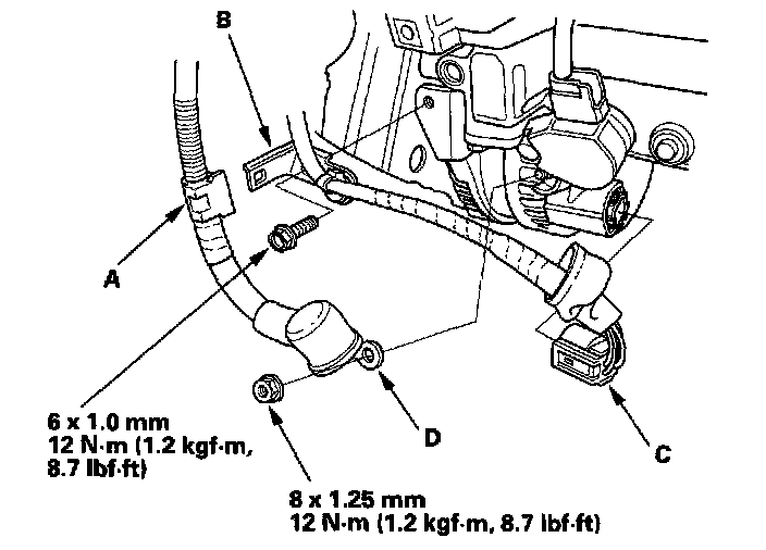 6. Disconnect the alternator connector (C) and BLK wire (D) from the alternator.