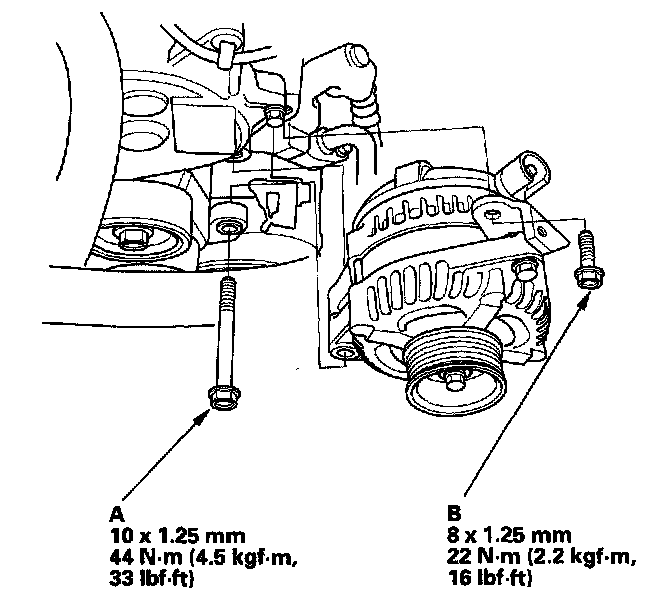 7. Remove the mounting bolt (A) and alternator bracket mounting bolt (B), then remove the alternator.