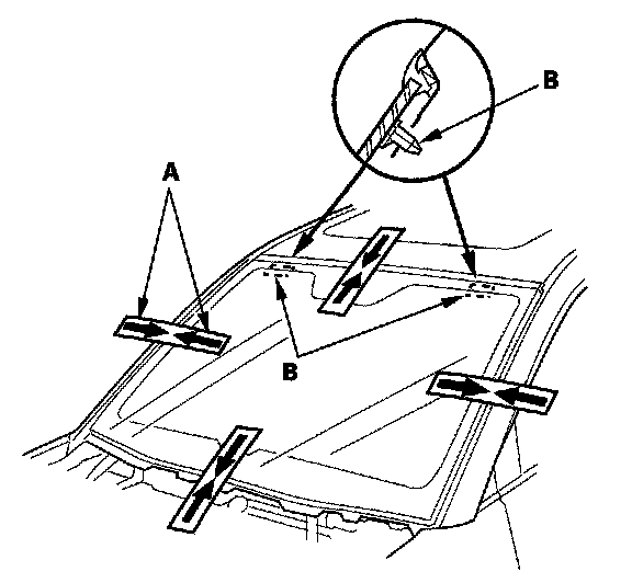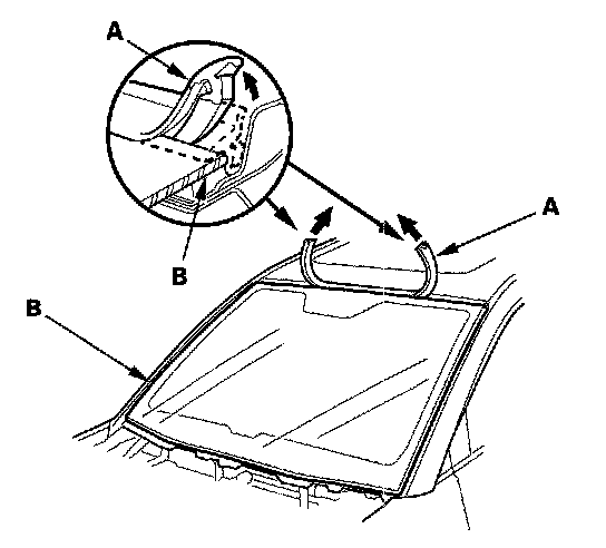2. Remove the molding (A) from the upper edge of the windshield (B). If necessary, cut the molding with a utility knife.
