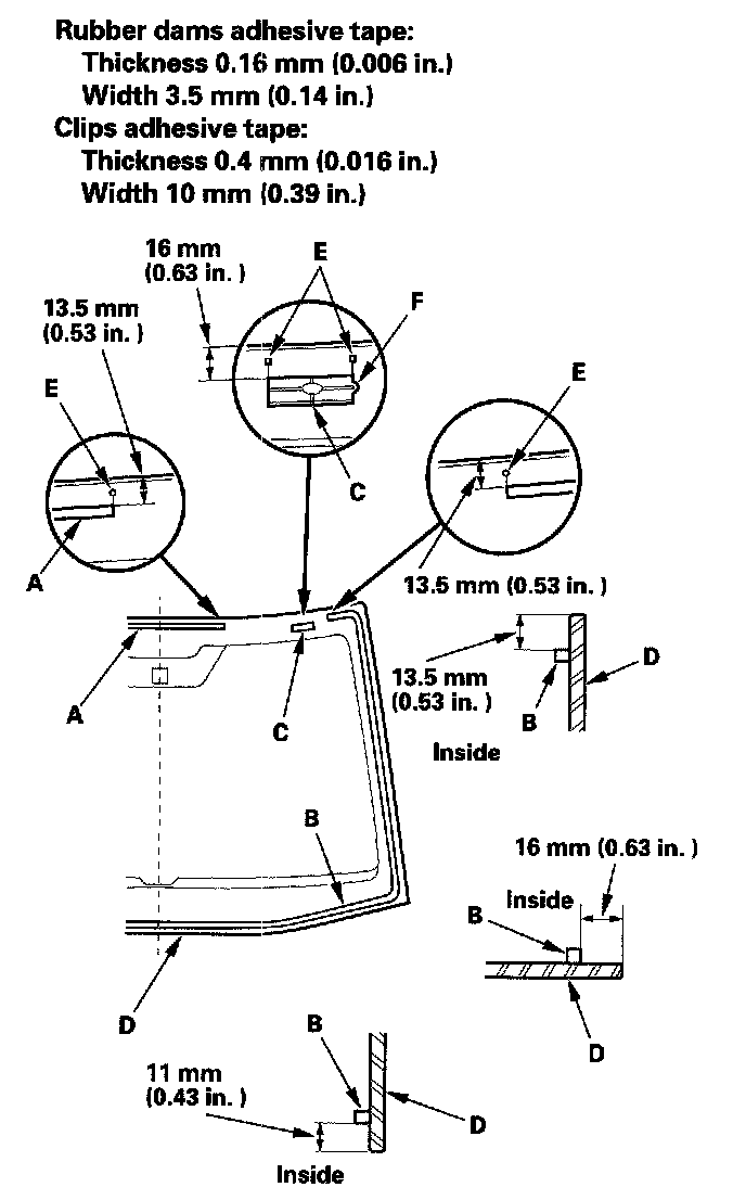 11. Attach the upper rubber dam (A), side rubber dam (B), and clips (C) with adhesive tape to the inside face of the windshield (D) as shown: