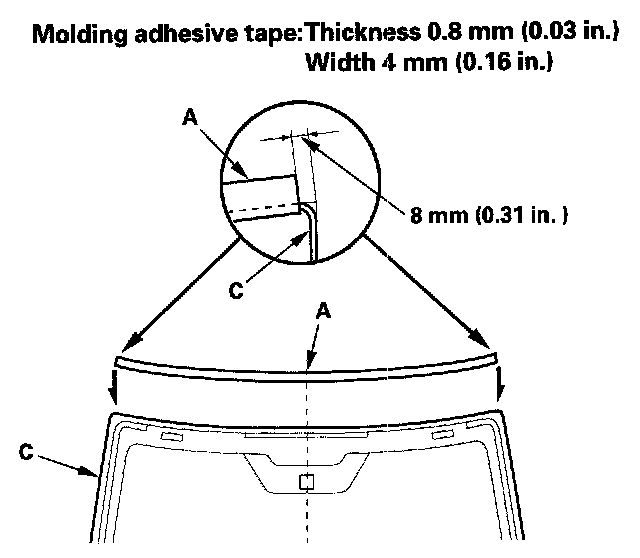 12. Attach the molding (A) with adhesive tape (B) to the upper edge of the windshield (C). Be careful not to touch the windshield where the adhesive will be applied.