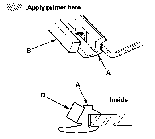 13. Apply primer to the molding (A), then attach the molding upper seal (B) with adhesive tape to the inside surface of the molding as shown.