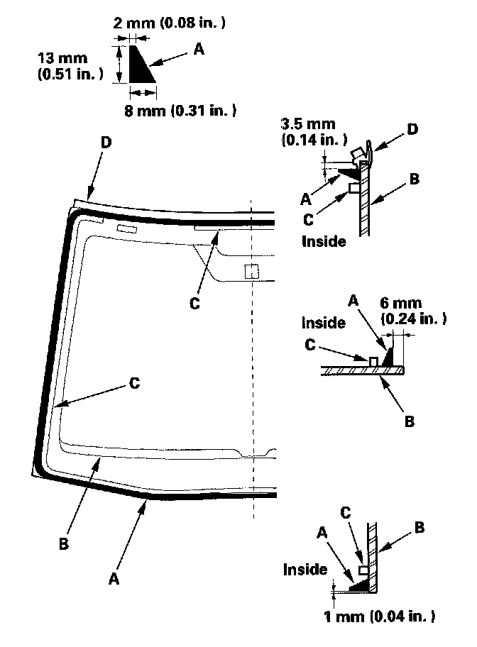 19. Put the cartridge in a caulking gun, and run a bead of adhesive (A) around the edge of the windshield (B) between the dams (C) and molding (D) as shown. Apply the adhesive within 30 minutes after applying the glass primer. Make a slightly thicker bead at each corner.