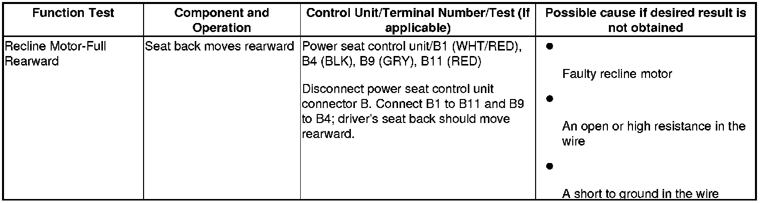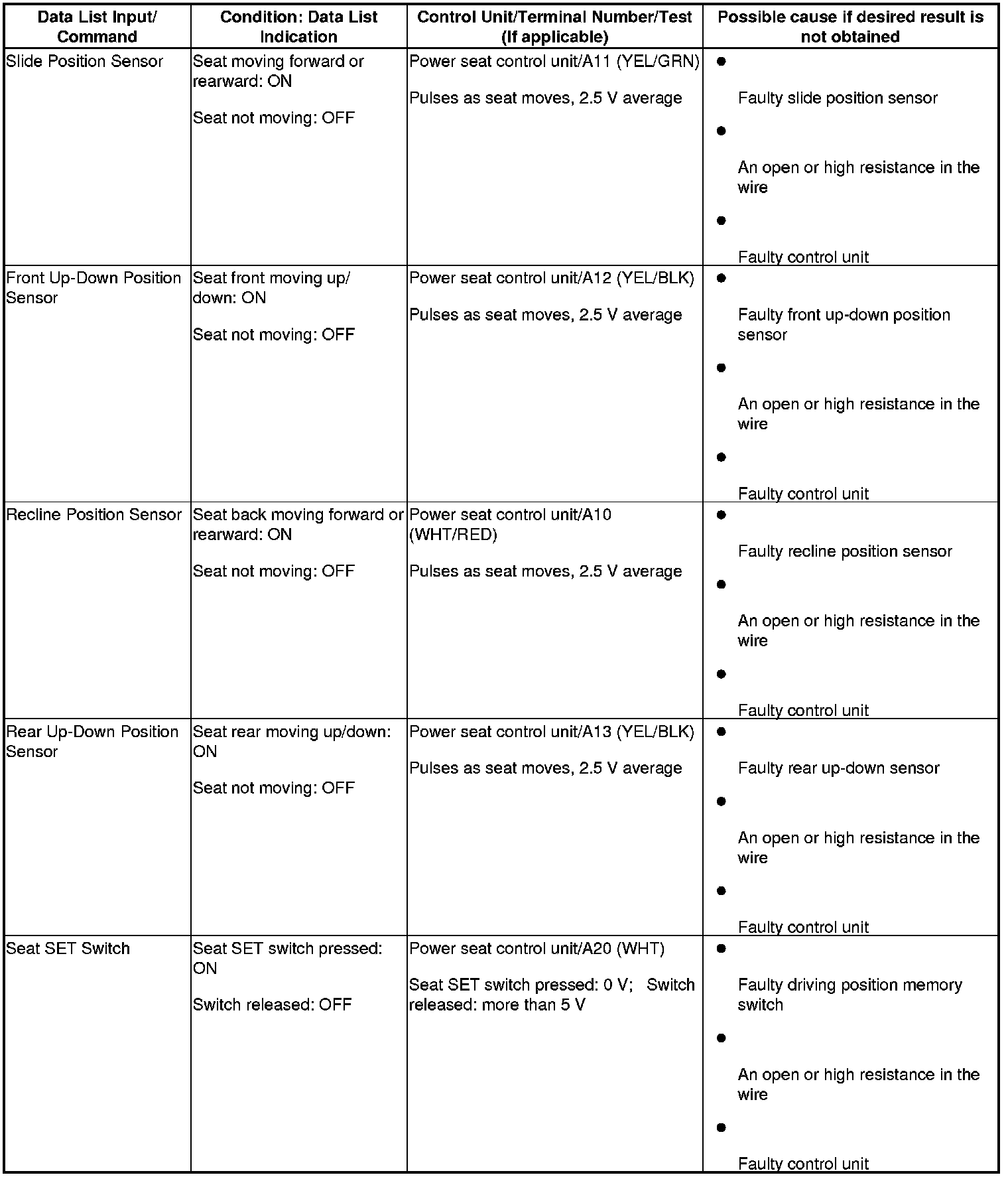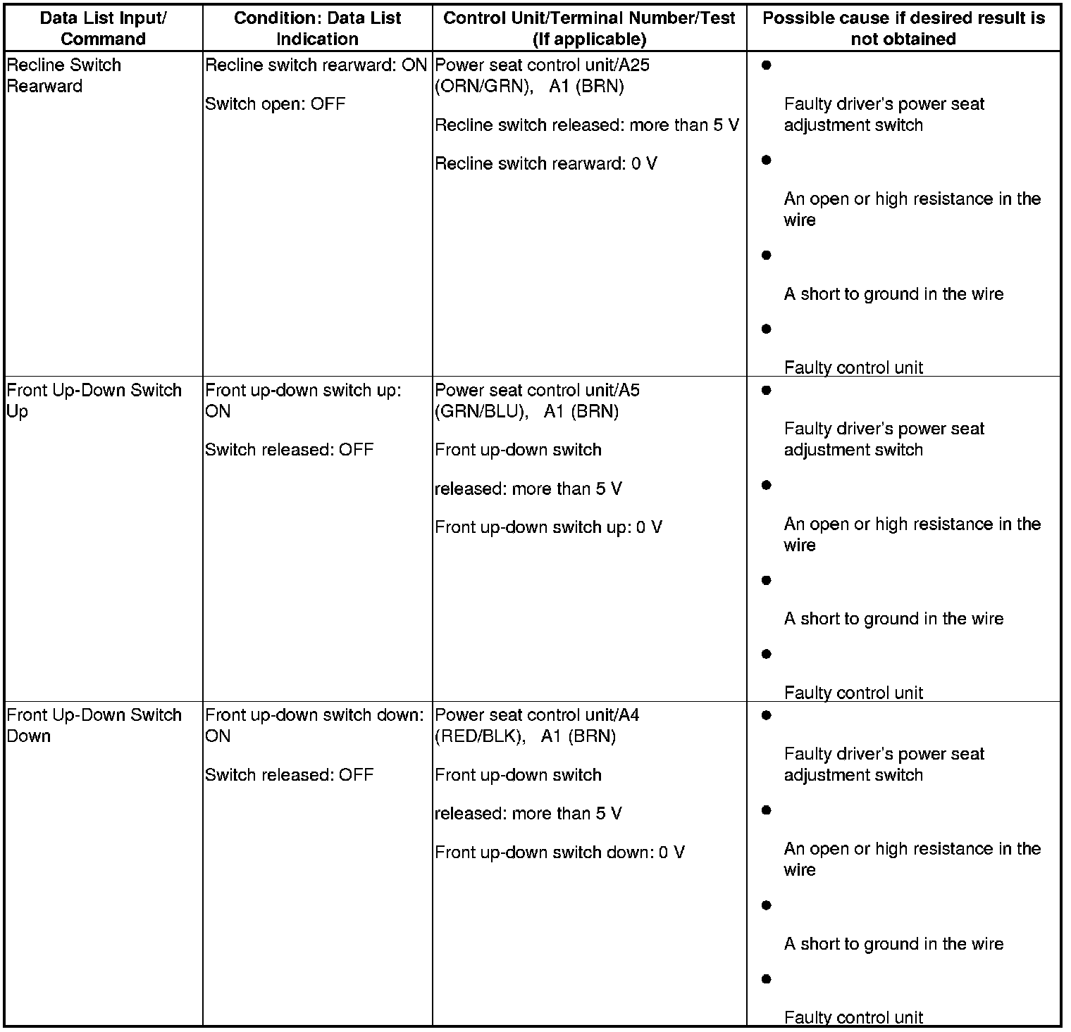 - If the function does not operate normally, perform the appropriate test at the control unit and terminal indicated in the table.