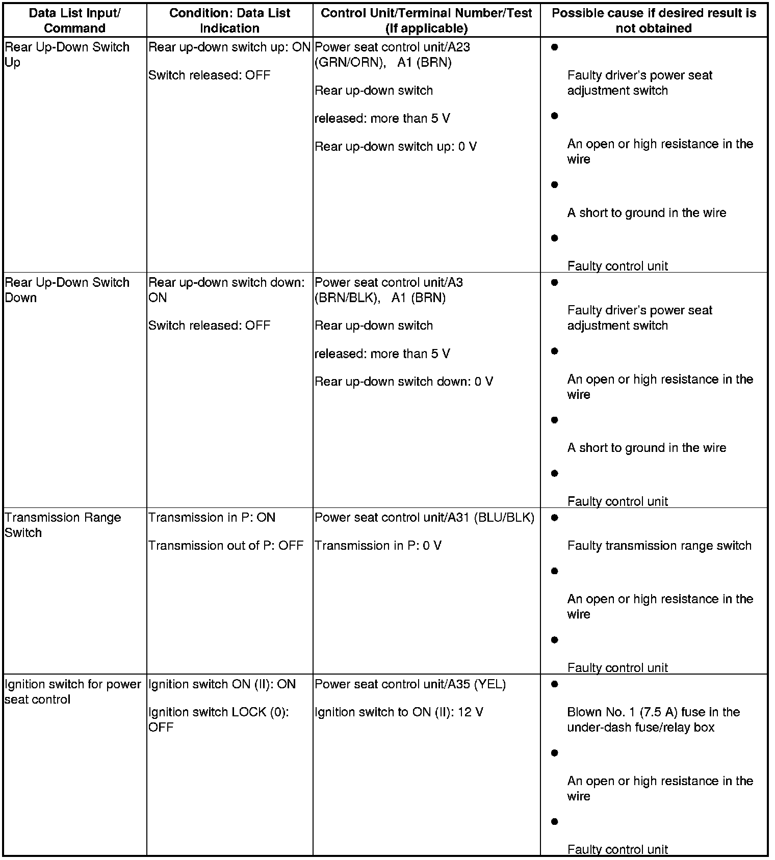 - If the DATA LIST indication is not correct, perform the appropriate test at the control unit and terminal indicated in the table.