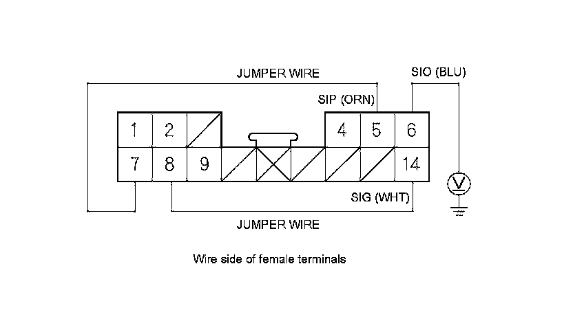 6. Connect a voltmeter and jumper wires as shown, then turn the ignition switch to ON (II) and do the following input tests: