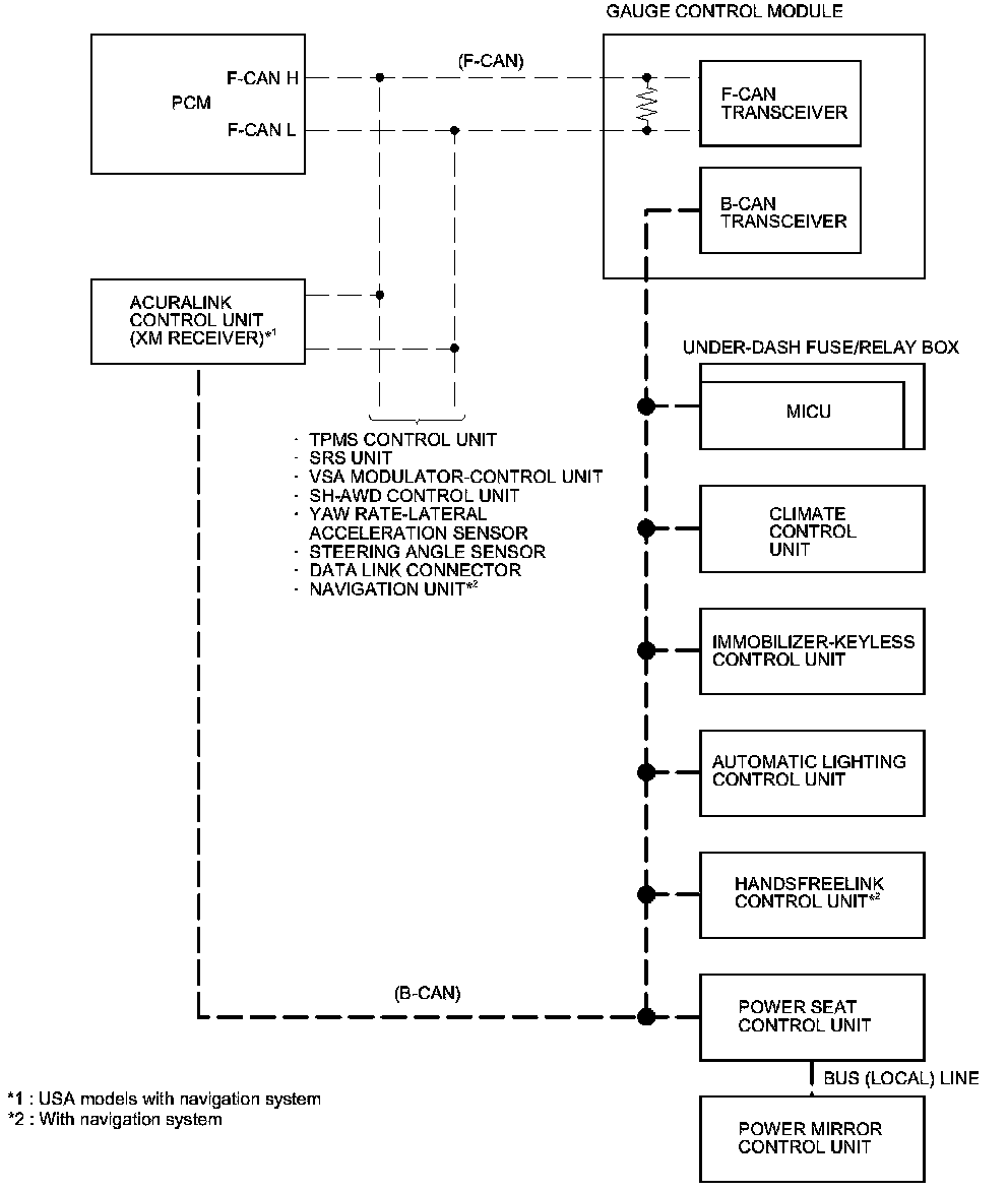The body controller area network (B-CAN) and the fast controller area network (F-CAN) share information between multiple electronic control units (ECUs). B-CAN communication moves at a slower speed (33.33 kbps) for convenience related items and for other functions. F-CAN information moves at a faster speed (500 kbps) for "real time" functions such as fuel and emissions data. To allow both systems to share information, the gauge control module translates and relays the information from B-CAN to F-CAN and from F-CAN to B-CAN. This is called the Gate Way Function.