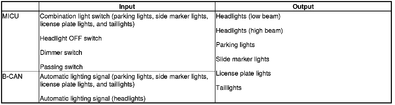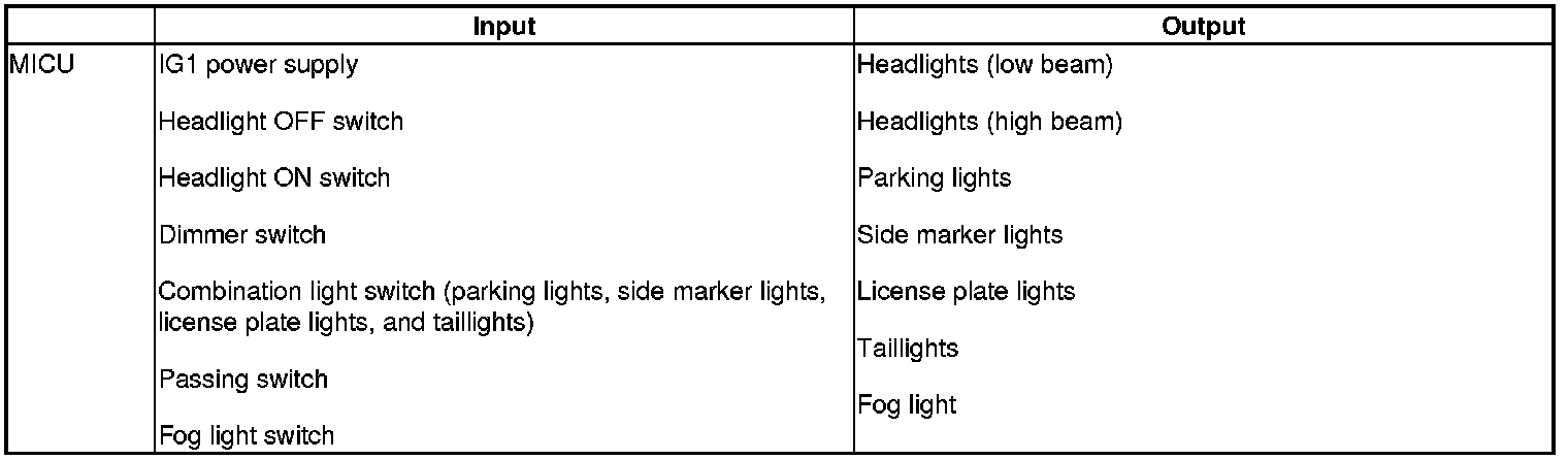 The MICU contains the relay circuits of the headlight high/low beam and taillights, and control of the lighting system ON/OFF is based on input signals from the combination light switch.