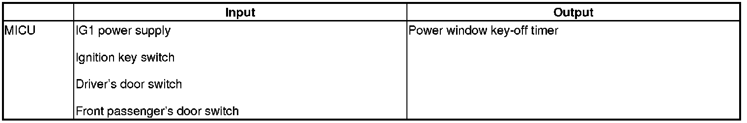 The MICU control of the rear window wiper motor and the washer motor is based on IG1, wiper/washer switch and the rear window wiper motor signals.