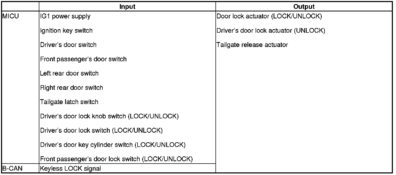 The MICU control of the door lock actuators is based on input signals of each switch and the B-CAN signals.