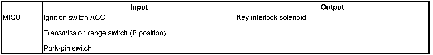The MICU control of the key interlock solenoid is based on IG1, the transmission range switch, and the park-pin switch signals.