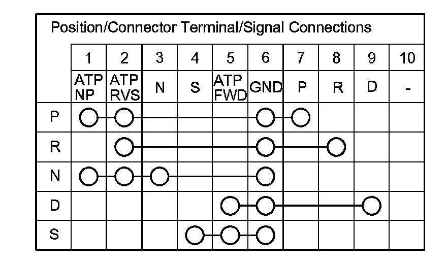 4. Check for continuity between terminals at the transmission range switch connector. There should be continuity between the terminals in the following table for each switch position.