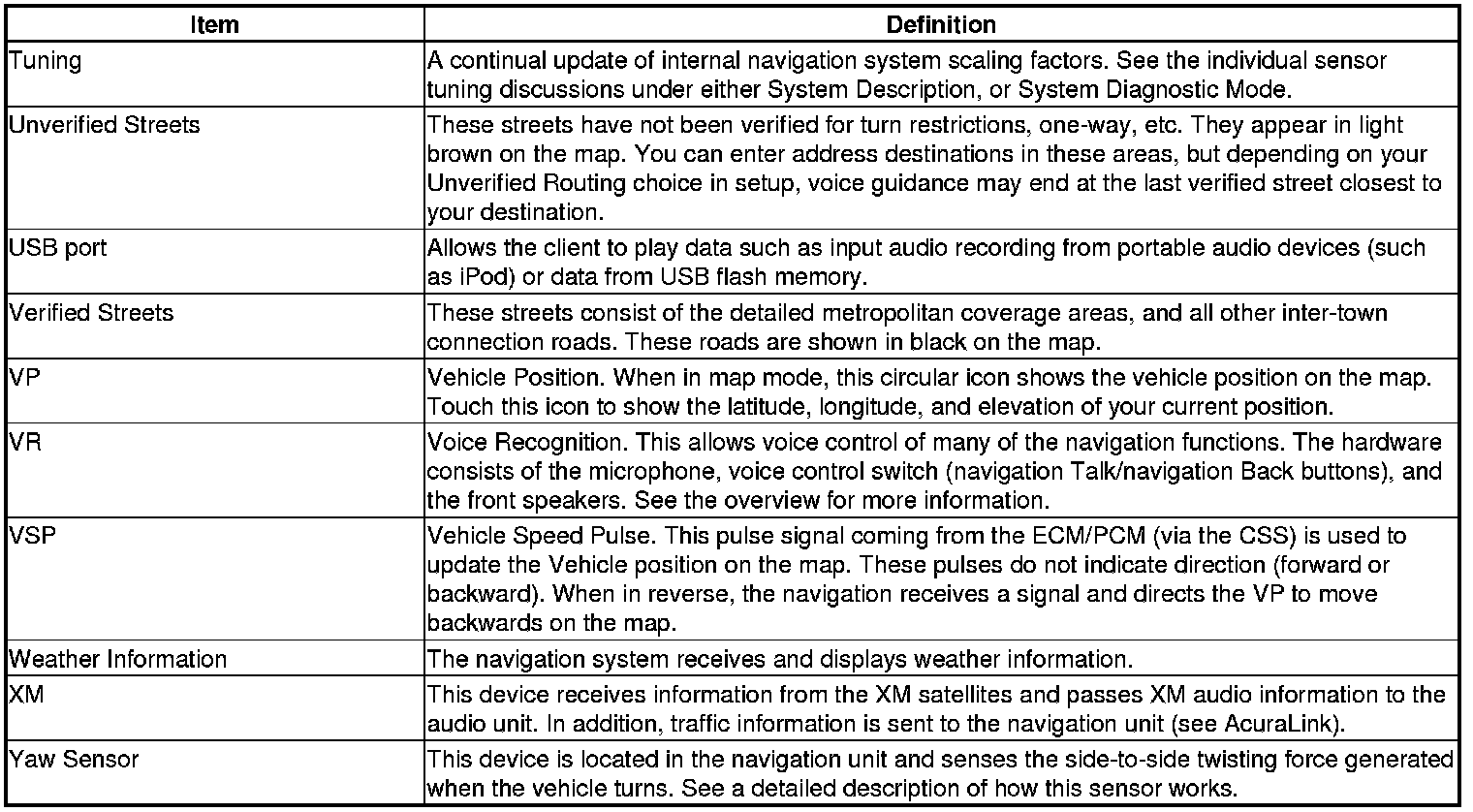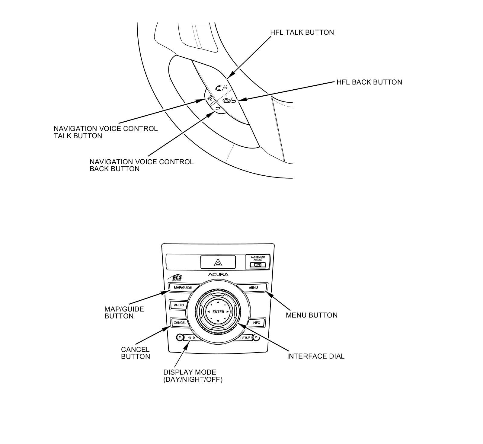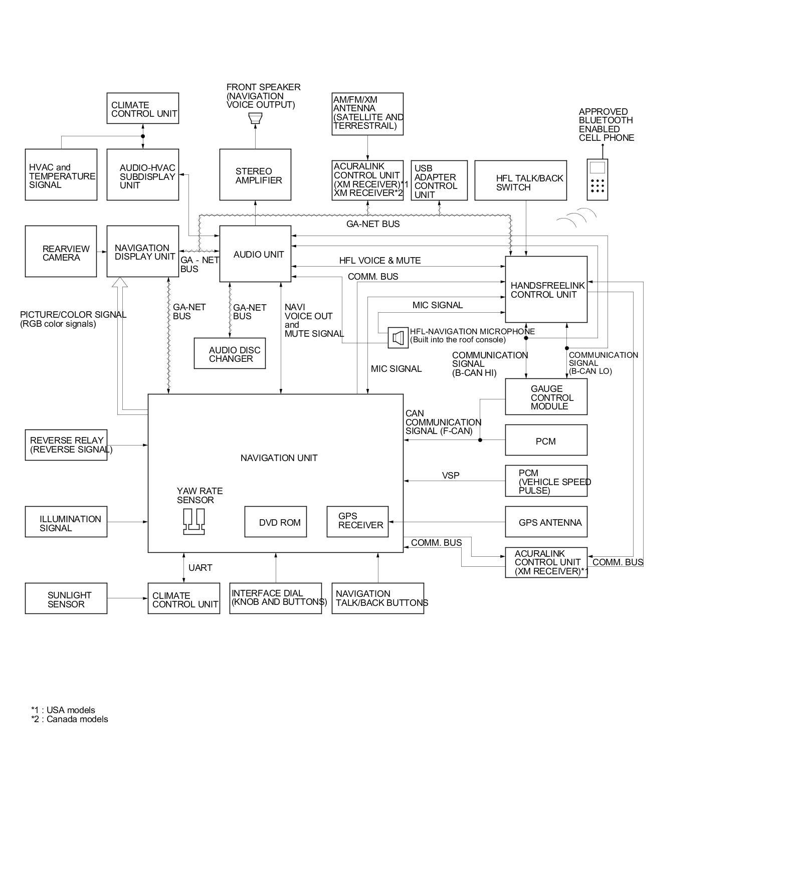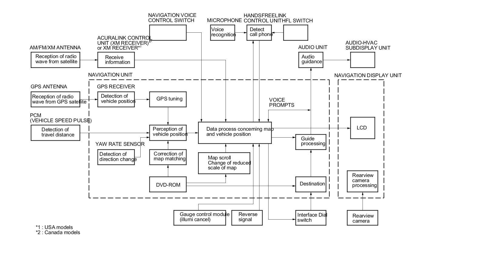 The navigation system is composed of the navigation unit, the PCM (vehicle speed pulse), AcuraLink control unit (XM receiver) (traffic and weather information), HandsFreeLink control unit (to send a POI phone number or place a call) the GPS antenna, the microphone, the voice control switch, the audio unit, and the audio-HVAC subdisplay unit.
