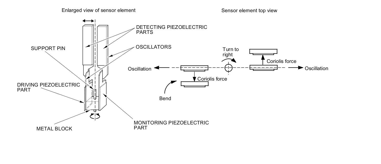 - When the vehicle turns to the right, the sensor element moves in a circular motion with the right oscillator bending forward and the left oscillator bending rearward. The amount of forward/rearward bend varies according to the angular velocity of the vehicle.