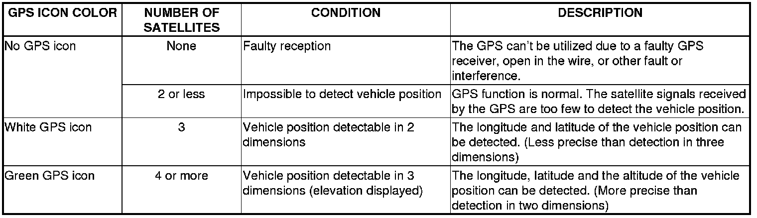 The navigation system receives signals from the global positioning system (GPS), a network of 24 satellites in orbit around the earth. By receiving signals from several of these satellites, the navigation system can determine the latitude, longitude, and elevation of the vehicle. In addition, signals from the system's yaw rate sensor and the PCM (vehicle speed pulse) enable the system to keep track of the vehicle's direction and speed of travel.