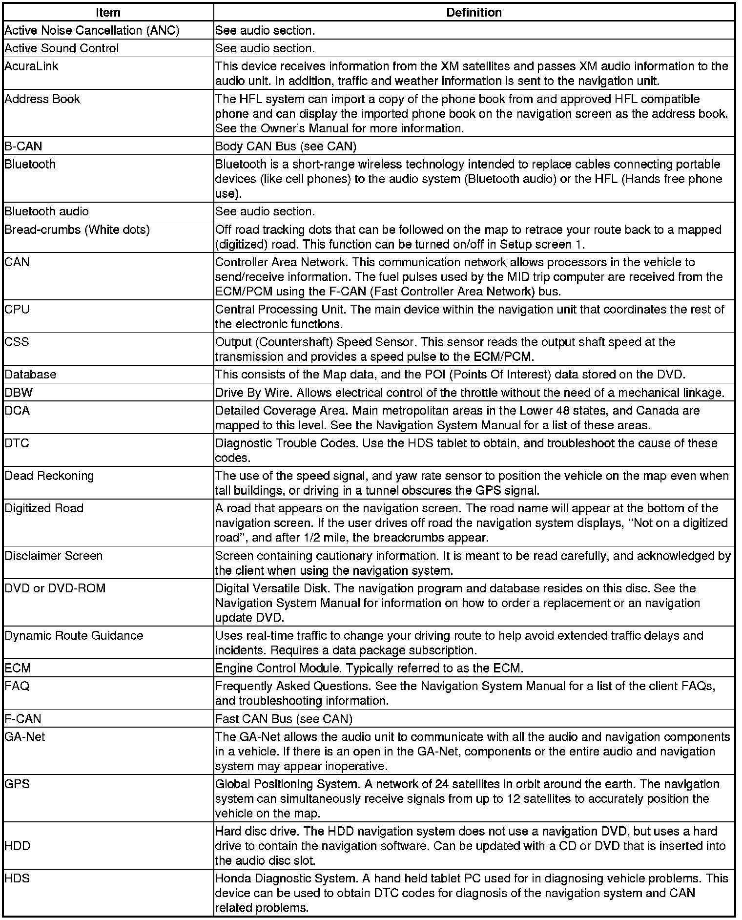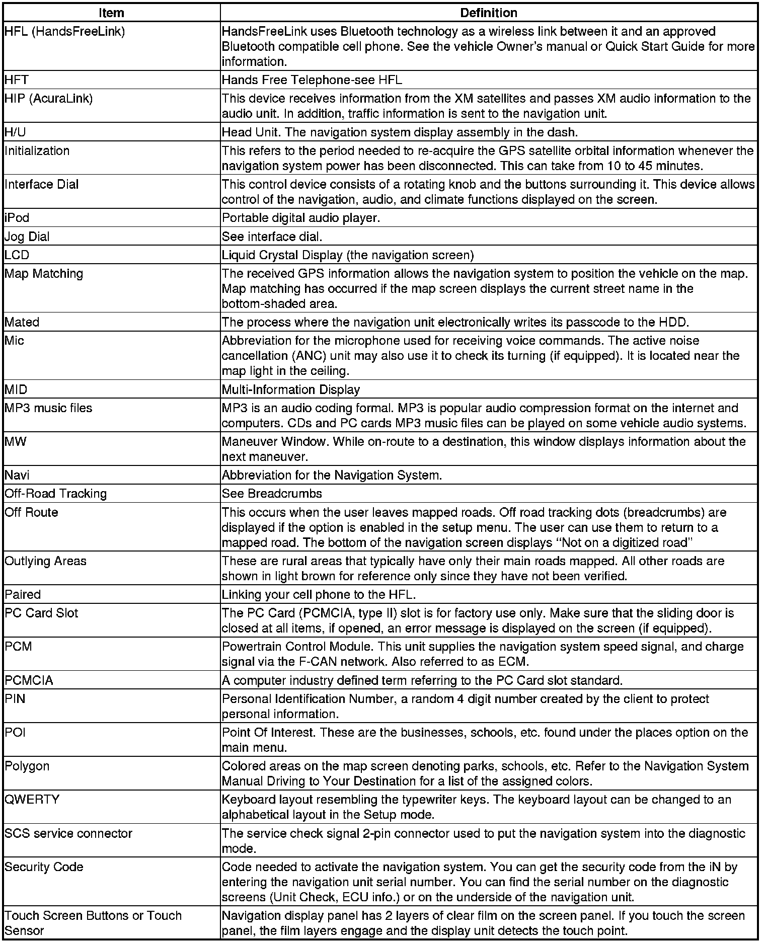 The following is a glossary of terms pertaining to the Voice Recognition Navigation System.