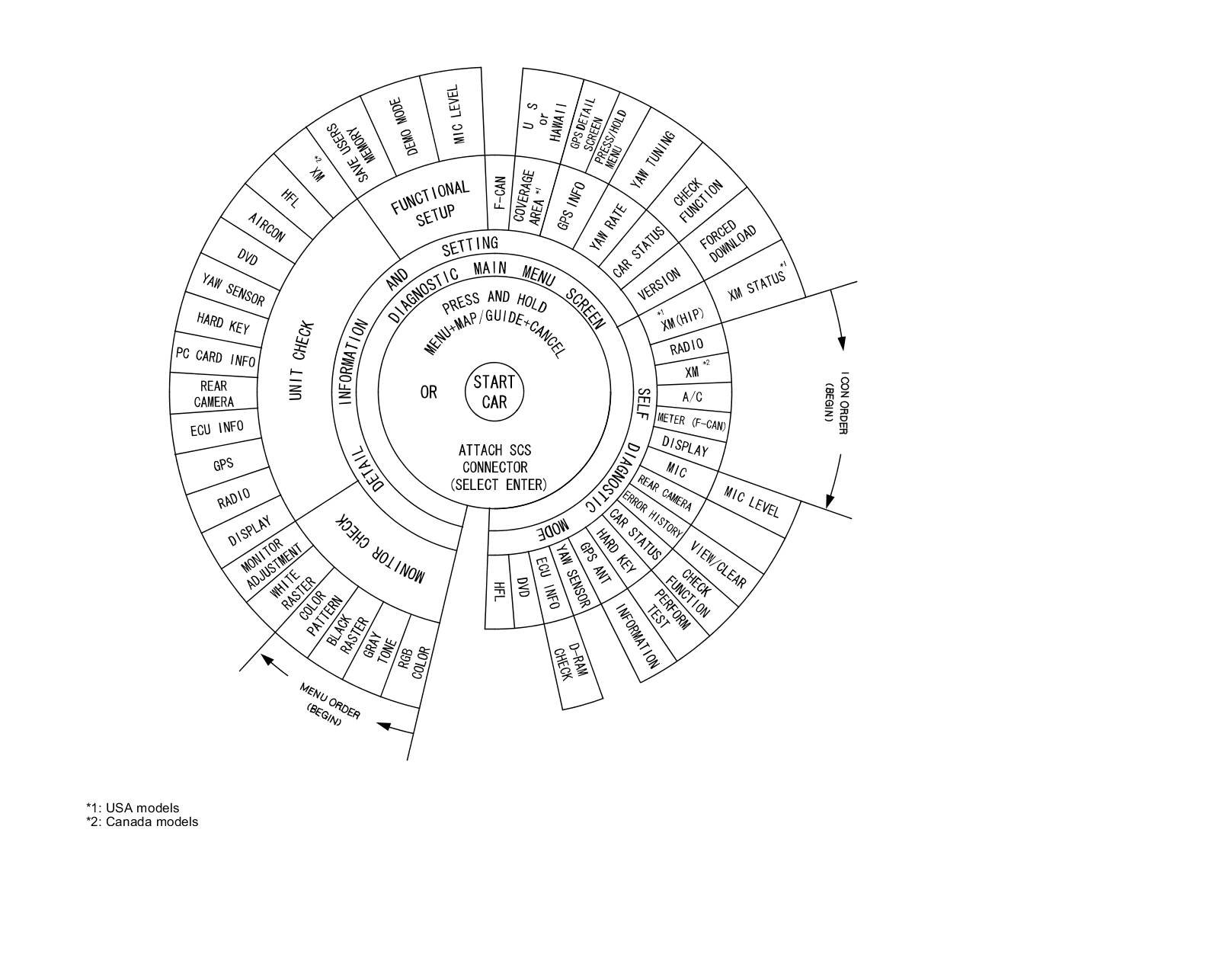 Access to the diagnostic features begins by starting the vehicle. This is necessary so the system can check the other systems connected by various busses. After starting the vehicle you can enter the diagnostic mode either by pressing and holding MENU, MAP/GUIDE, and CANCEL, or by connecting the 2P SCS service connector.