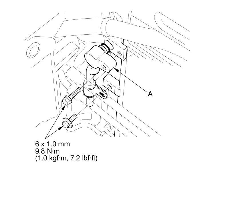 5. Remove the bolt, then disconnect the receiver line (A) from the A/C condenser.