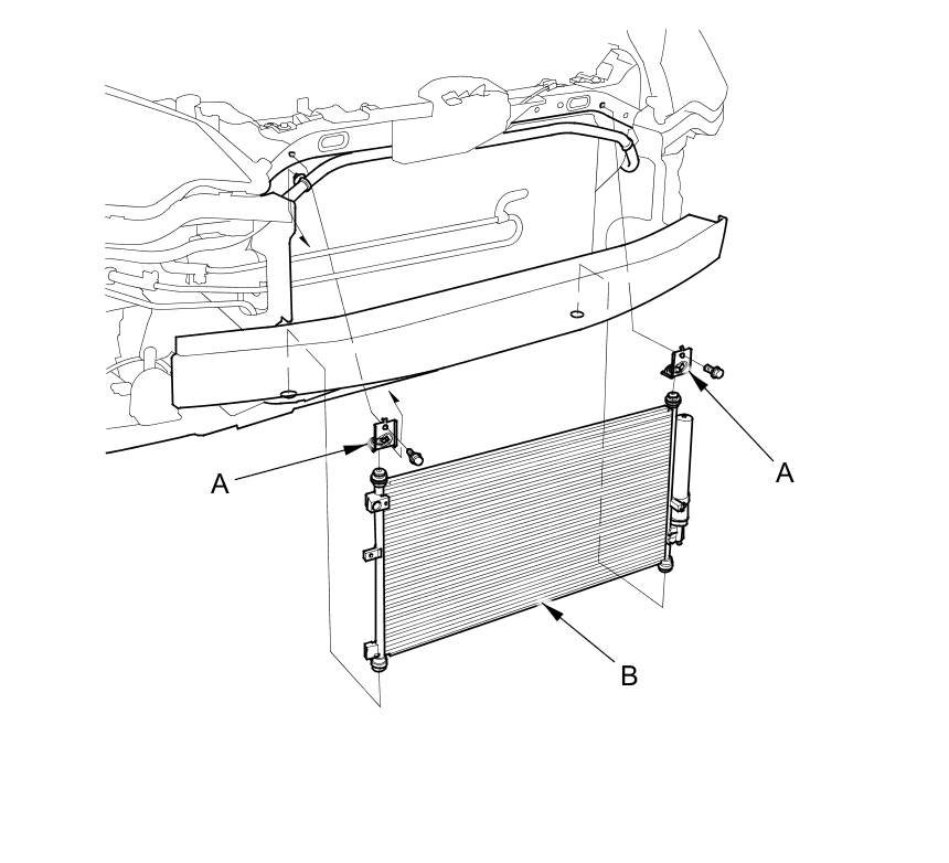 7. Remove the bolts and brackets (A), then remove the A/C condenser (B). Be careful not to damage the radiator and the A/C condenser fins when removing the A/C condenser.