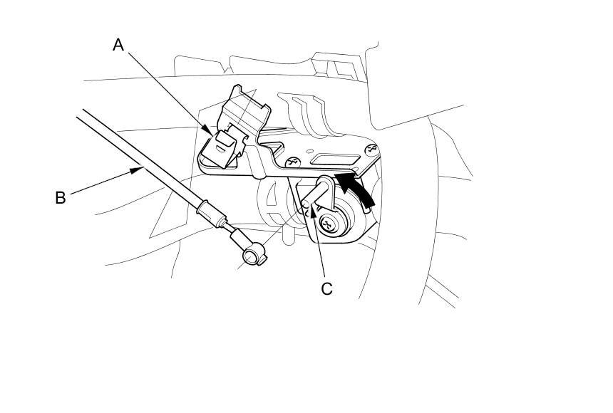 4. From under the hood, open the cable clamp (A), then disconnect the heater valve cable (B) from the heater valve arm (C). Turn the heater valve arm to the fully opened position as shown.