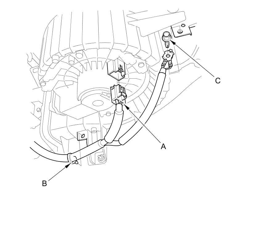 9. Disconnect the connector (A) from the blower motor. Remove the wire harness clip (B) and the ground terminal bolt (C).