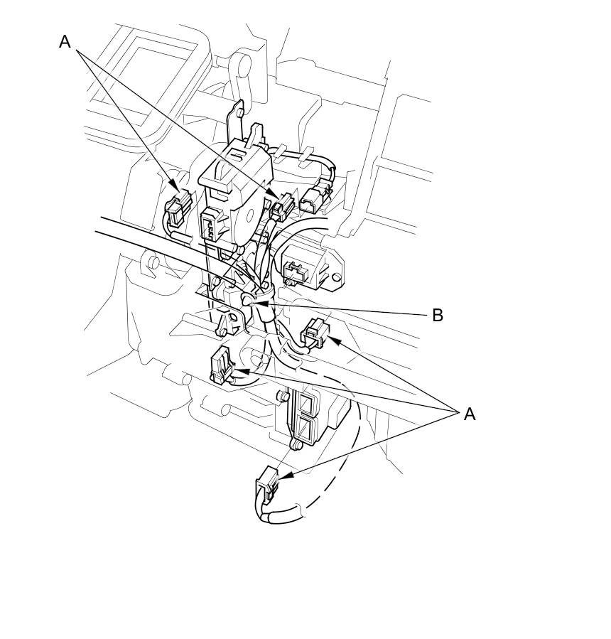 11. Disconnect these connectors (A) from the climate control unit, the mode control motor, the passenger's air mix control motor, the evaporator temperature sensor, and the power transistor. Remove the wire harness clip (B).