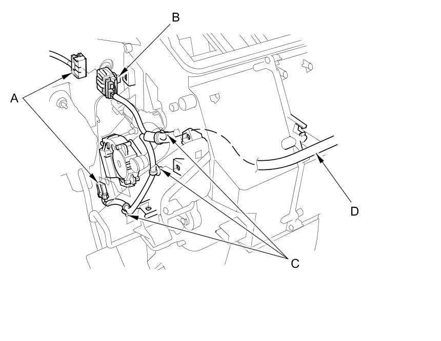 12. Disconnect these connectors (A) from the driver's air mix control motor and the A/C wire harness. Remove the connector clip (B), the wire harness clips (C), and the wire harness (D).
