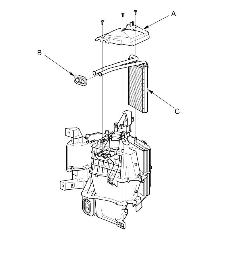 14. Remove the self-tapping screws, the heater core cover (A), the grommet (B), and carefully pull out the heater core (C).
