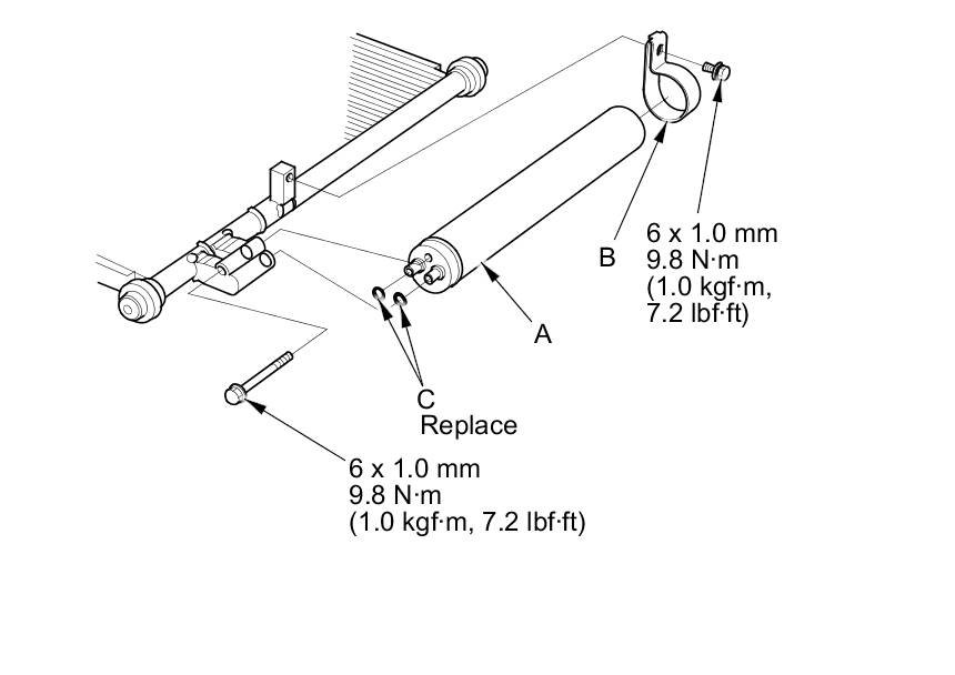 2. Remove the bolts from the A/C condenser, then remove the receiver/dryer (A), the bracket (B), and the O-rings (C).