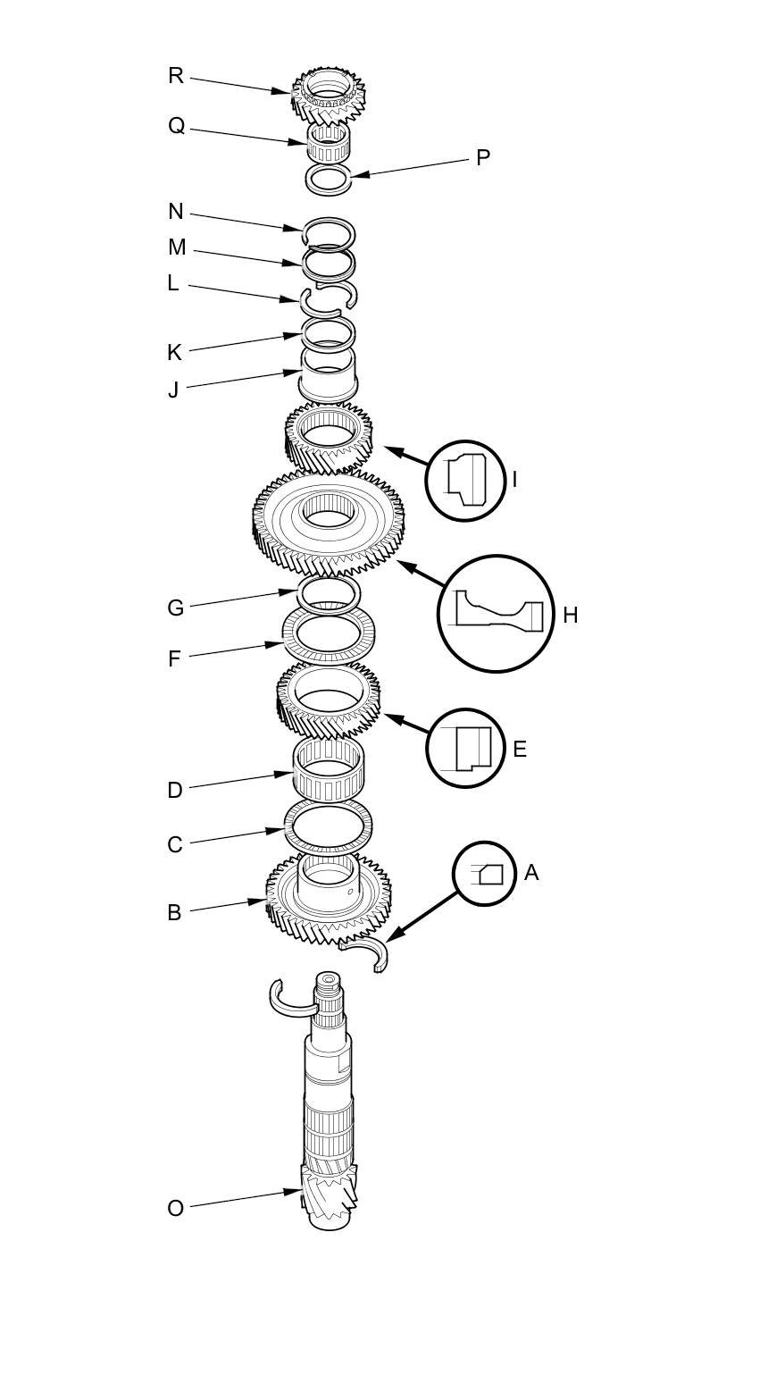 2. Install the 35 x 47 x 3 mm thrust washer (P), the needle bearing (Q), and 5th gear (R).