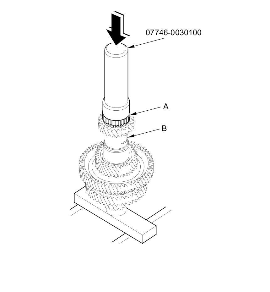 3. Slide the reverse selector hub (A) over the countershaft (B), then press it into place using the driver handle (40 mm I.D.) and a press.