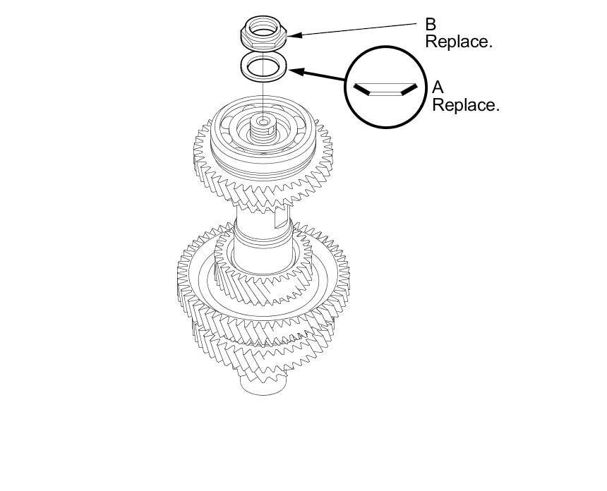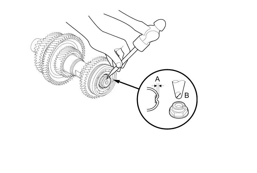 8. Stake the locknut into the shaft to a depth (A) of 0.7-1.3 mm (0.03-0.05 in) using a 3.5 mm punch (B).