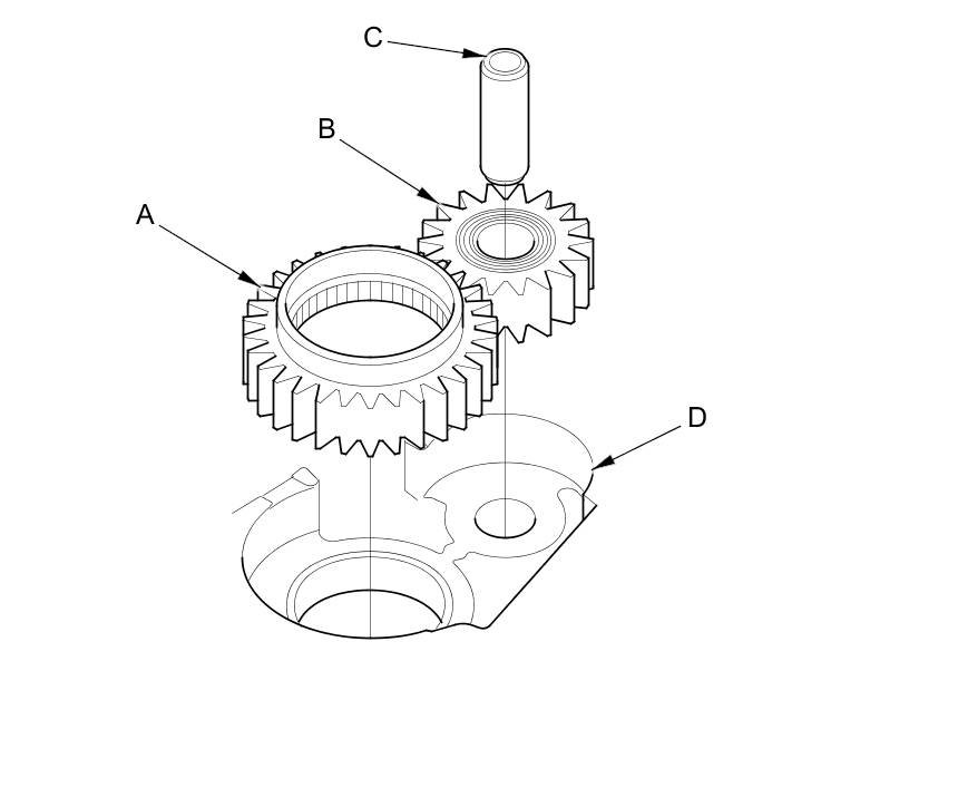 1. Install the ATF pump drive gear (A), the driven gear (B), and the ATF pump driven gear shaft (C) in the main valve body (D). Lubricate all parts with ATF, and install the ATF pump driven gear with its grooved and chamfered side facing up.