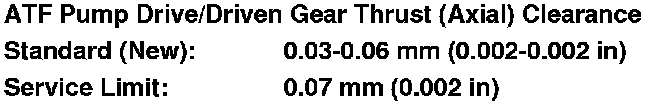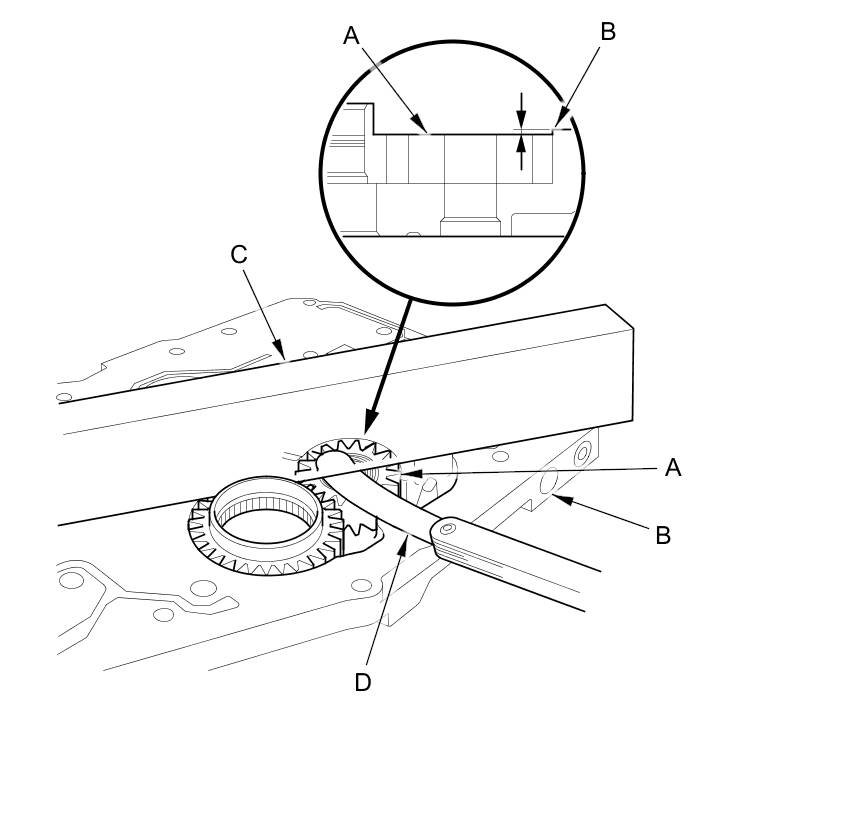 3. Remove the ATF pump driven gear shaft. Measure the thrust clearance between the ATF pump driven gear (A) and the main valve body (B) using a straight edge (C) and a feeler gauge (D).