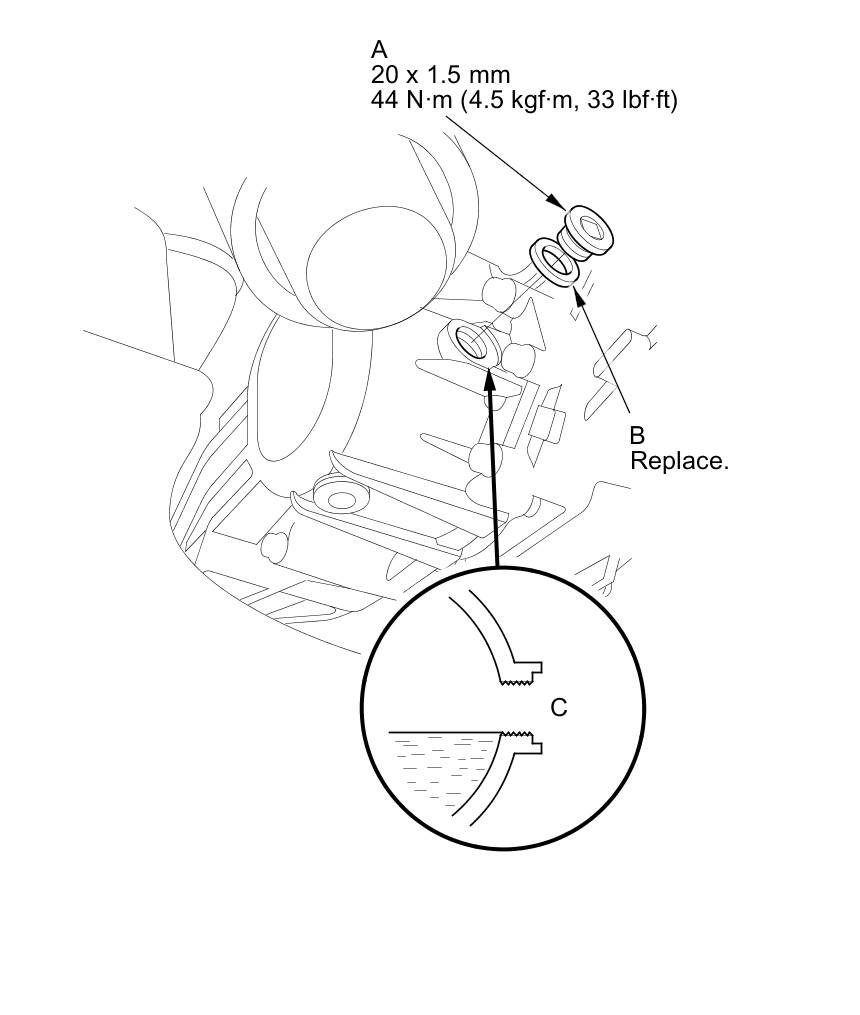 6. Refill the transfer assembly with the recommended fluid (hypoid gear oil) through the filler hole (C) until the fluid flows out. Use a SAE 90 viscosity hypoid gear oil, API classified GL4 or GL5 only.