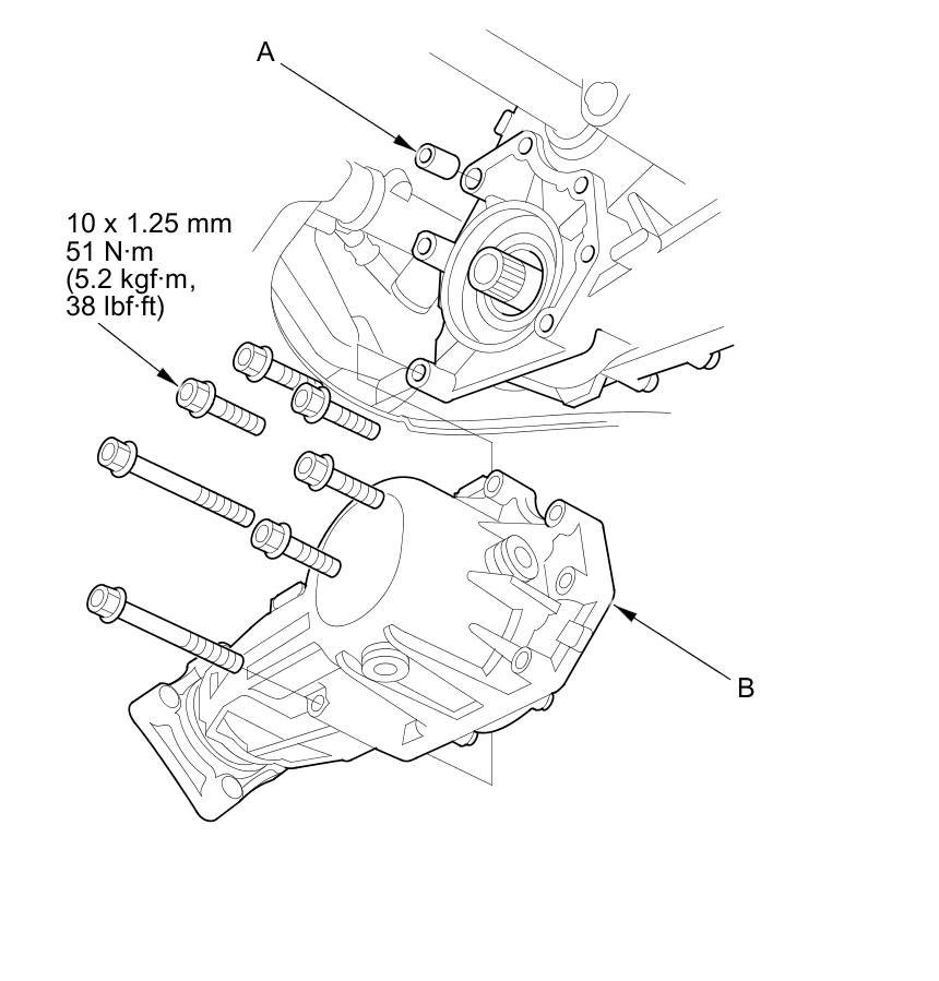 2. Install the dowel pin (A) in the transmission, and install the transfer assembly (B) on the transmission.