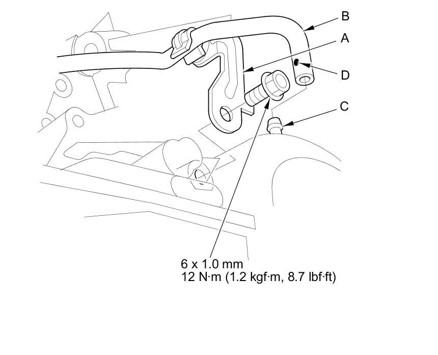 4. Secure the transfer breather hose bracket (A) on the transfer assembly with the bolt, and install the breather hose (B) over the breather pipe (C) with the dot (D) facing toward the rear.