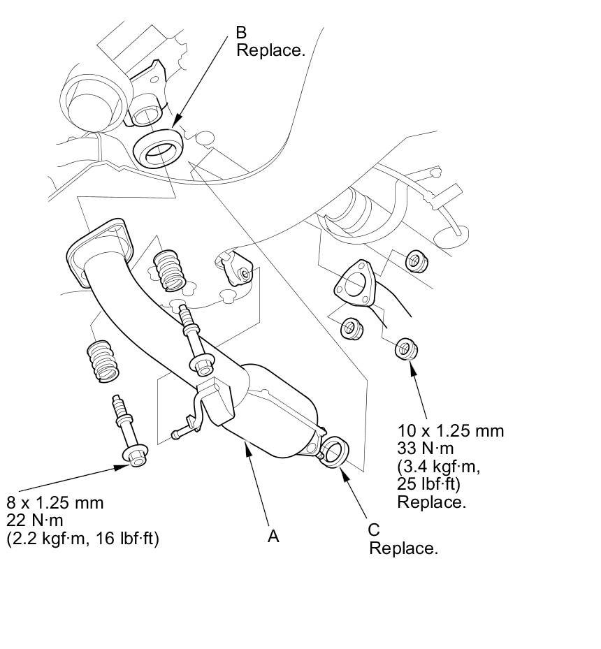 5. Install the three-way catalytic converter (A) with the new self-locking nuts and new gaskets (B) (C).