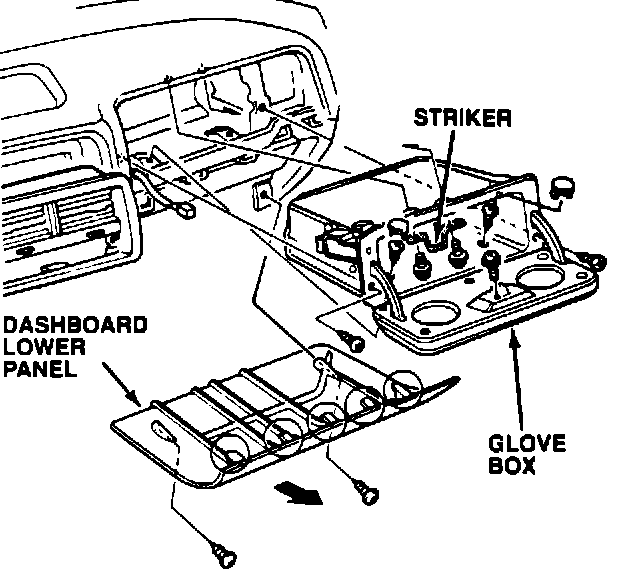 2. Remove the six glove box screws and the striker, then disconnect the glove box light connector. Remove the glove box from the dashboard.