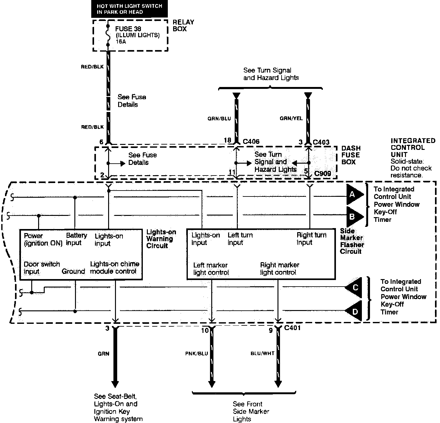 Integrated Control Unit: Entry Light, Light-on Warning, Rear Window Defogger Timer And Side Marker Flasher Circuits: