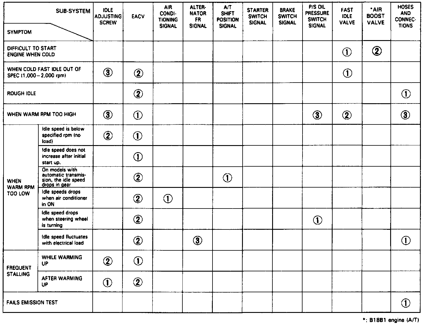 - Across each row in the chart, the sub-systems that could be sources of a symptom are ranked in the order they should be inspected, starting with (1). Find the symptom in the left column, read across to the most likely source, then refer to the system or component listed at the top of that column. If inspection shows the system is OK, try the next system (2), etc.