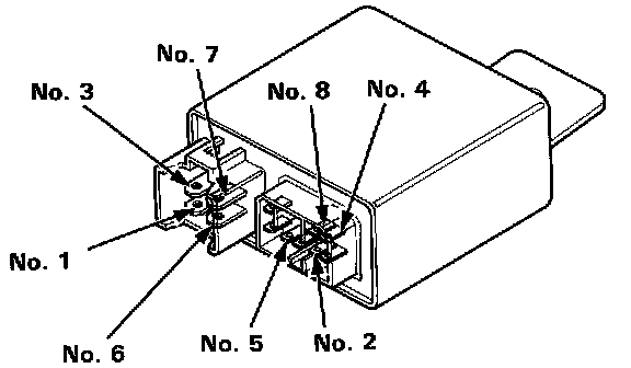4. Attach the battery positive terminal to the No. 3 terminal and battery negative terminal to the No. 8 terminal of the main relay. Then check that there is continuity of the main relay. Then check that there is continuity between the No. 5 terminal and No. 7 terminal of the main relay.