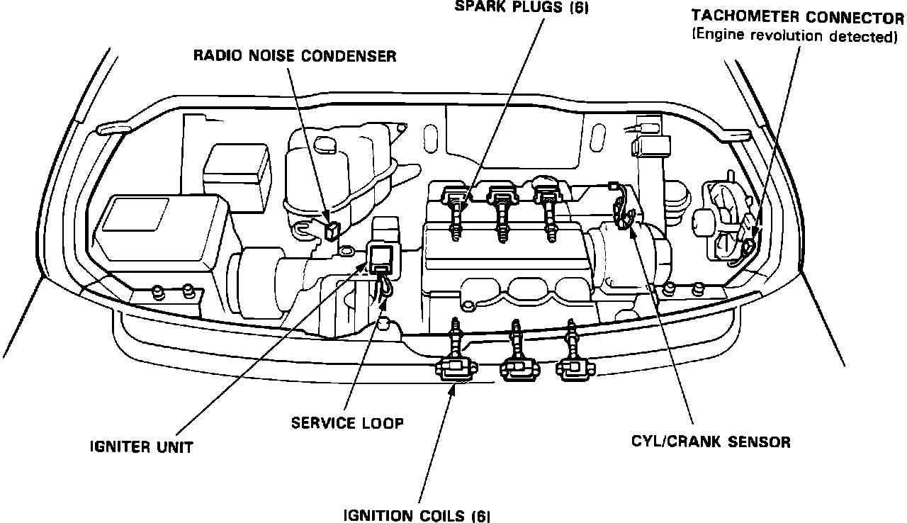 The tachometer connector is located on the passenger side of the engine compartment near the fan