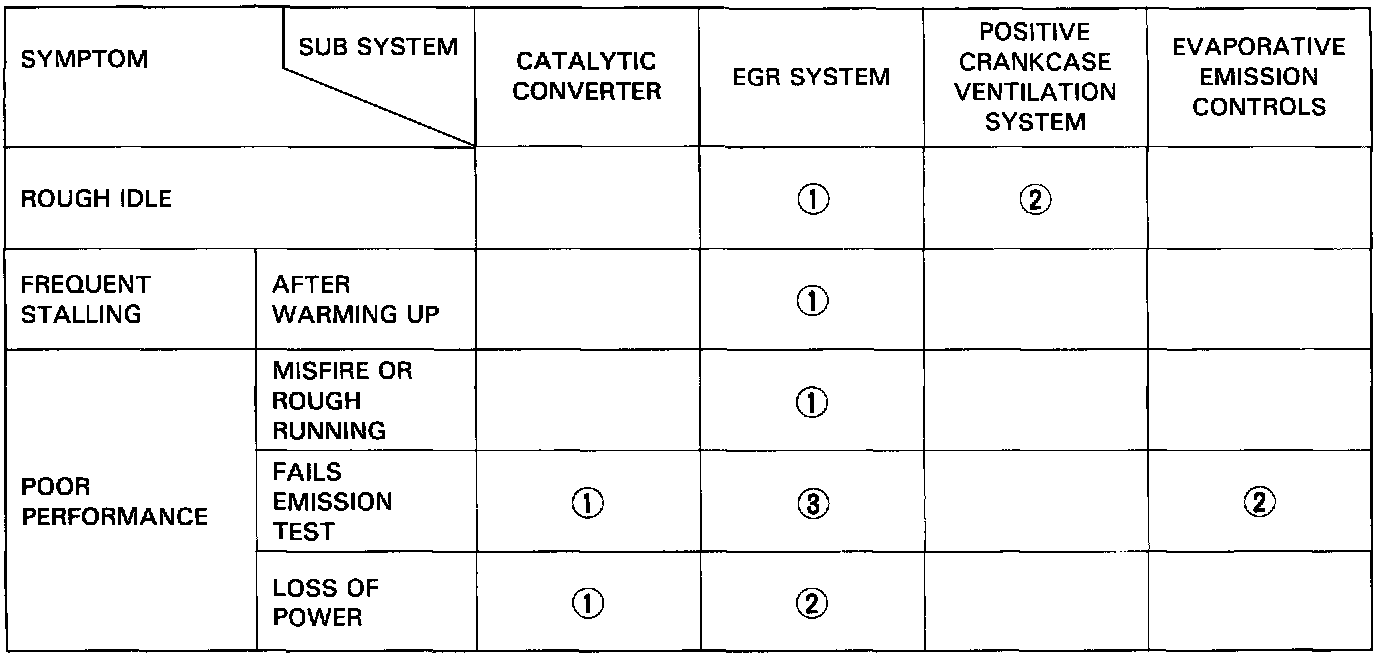 NOTE: Across each row in the chart, the systems that could be sources of a symptom are ranked in the order they should be inspected starting with (1). Find the symptom in the left column, read across to the most likely source, then refer to the system or component listed at the top of that column. If inspection shows the system is OK, try the next most likely system (2), etc.