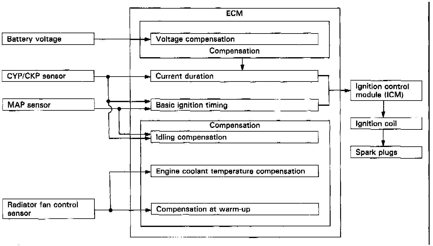 The ECM has stored within it the optimum basic ignition timing for operating conditions based upon engine speed and intake manifold pressure. With compensation by signals from sensors, the system determines optimum timing for ambient conditions and sends voltage pulses to the ignition control module.