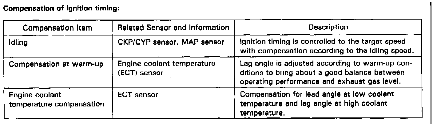 Ignition timing is fixed at 7° BTDC for cranking. The cranking is detected by the CYP sensor (cranking rpm) and starter signal.