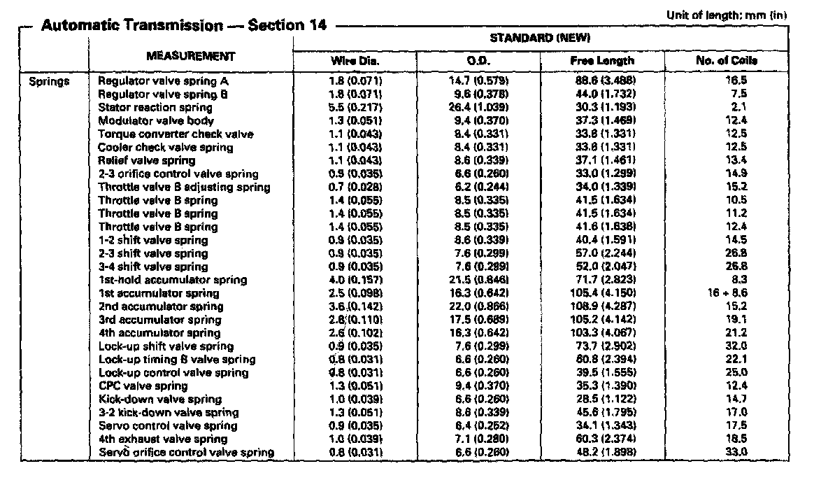 MP7A 4-spd A/T, Transmission Spring Measurements: