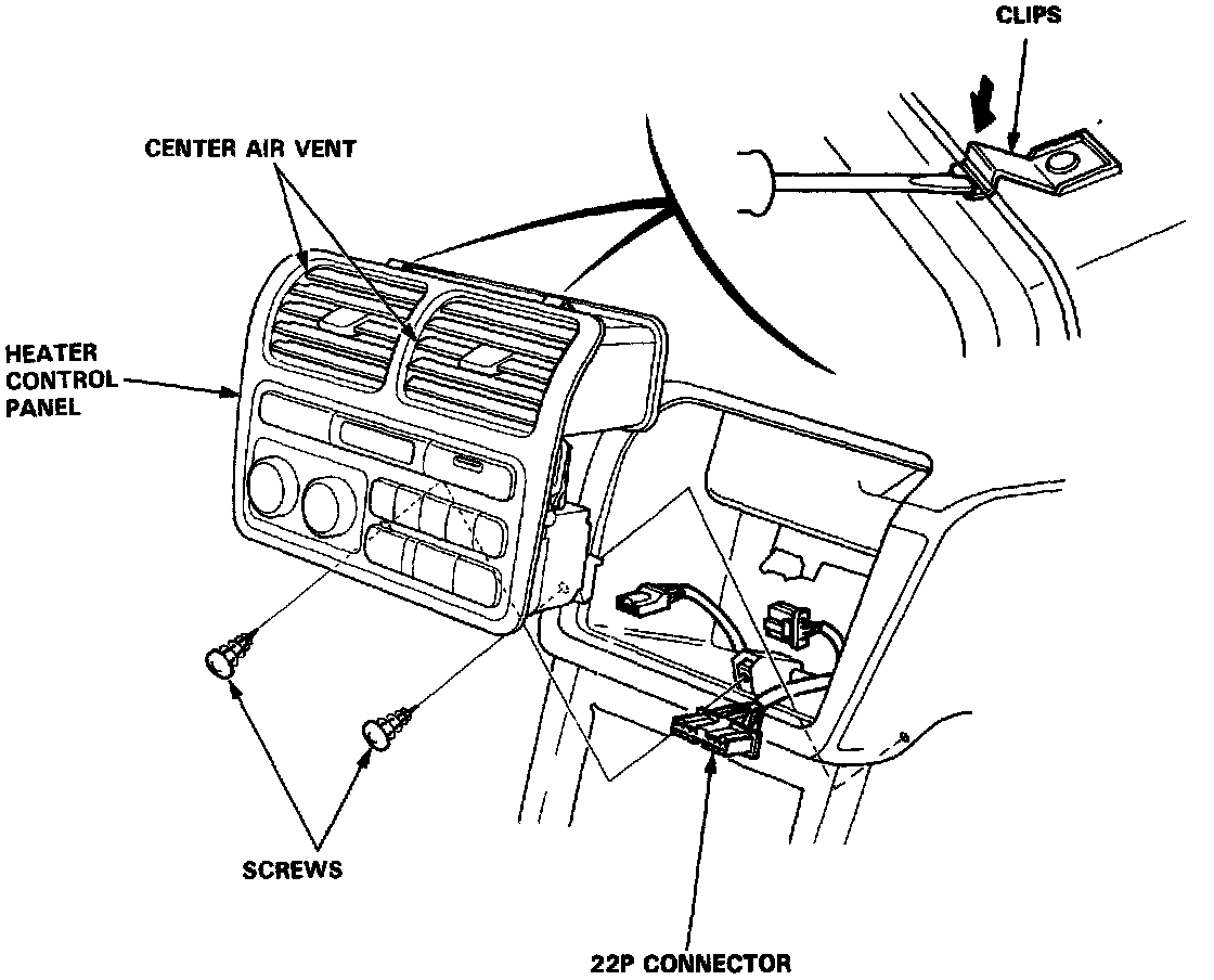3. Remove the heater control panel assembly by pushing the clips down as shown.