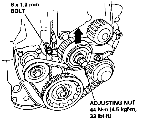11. Lock the timing belt adjuster arm in place by installing one of the 6 x 1.0 mm bolts.