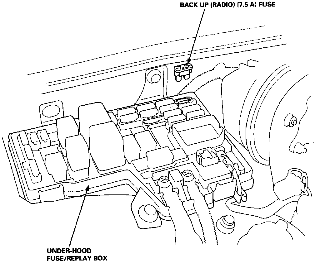 - Turn the ignition switch OFF. Remove the BACK UP (RADIO) (7.5 A) fuse from the under-hood fuse/relay box for 10 seconds.